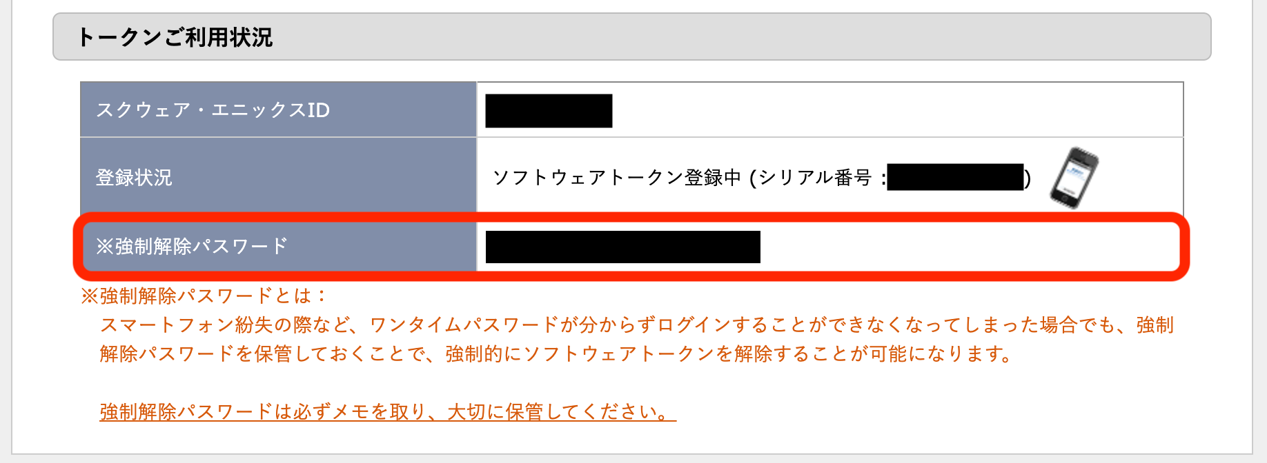 ソフトウェアトークン 強制解除パスワードを必ずお控えください